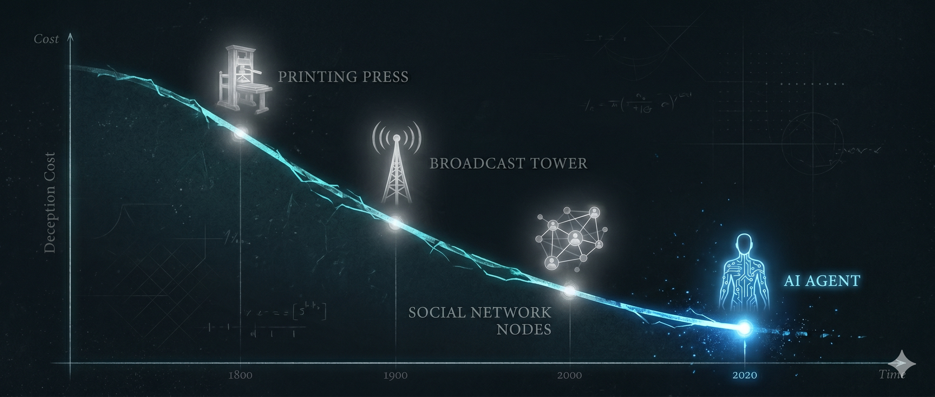 Every major information technology has lowered it. The printing press made it possible to distribute false claims at scale without personal exposure. Broadcast media concentrated that power in fewer hands, but also created mass audiences receptive to narratives that had never needed to withstand local social scrutiny. Social media eliminated the last friction — anyone could reach millions with a fabricated claim at zero marginal cost, with no accountability infrastructure capable of keeping pace.